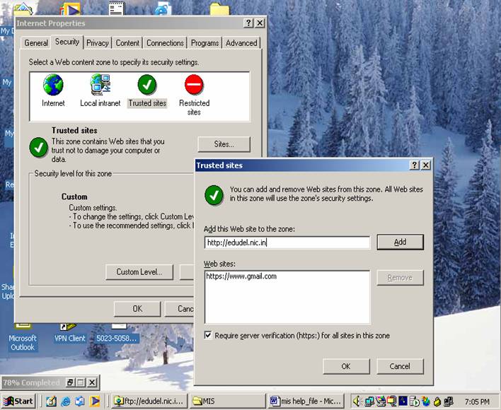 06. In the next step select the trusted sites then click on the sites…. button. After the clicking this button there will show a new window that name is trusted sites. You should write the Del E site address that is (“http://edudel.nic.in “). And then click on “ADD”, ””OK” |